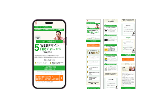 WEBデザインスクールLP 投稿日: 2025年11月25日2025年11月25日 投稿者: shiawase-design-oonuki WEBデザインスクールLPデザイン 使用ツール:Photoshop イメージカラー:緑 第一印象:男女ともに親しみやすい印象 制作意図 訴求を意識して、見出しでボタンが表示されるようにデザインを調整しました。また、特に読んでほしいサービス内容のセクションでは画面を大きく使い目に留まりやすいようデザインしました。全体としてメリハリを意識しつつ統一感のあるデザインとなっております。